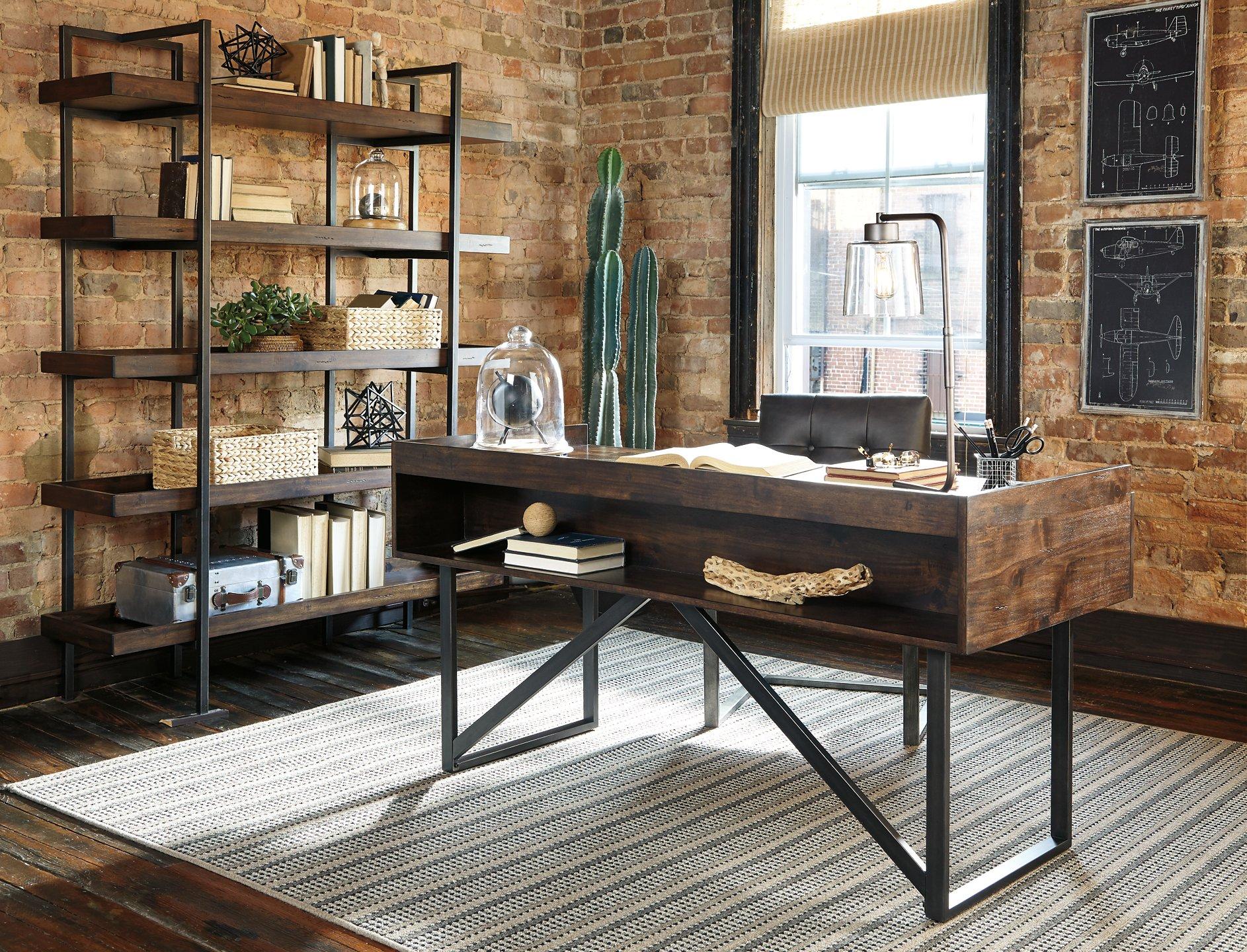 Pour les amateurs de design industriel urbain, ce bureau est un véritable atout. Son plateau est réalisé dans un mélange de placage d'acacia et de bois, sublimé par une finition noyer huilé. Un élégant cadre tubulaire en métal et de grandes poignées linéaires complètent l'ensemble. La tablette découpée sur la face avant du bureau lui confère une dimension supplémentaire.